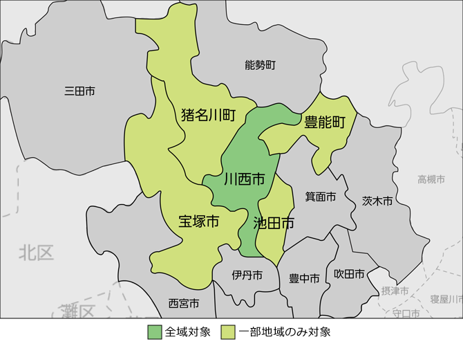 - 猪名川台、上野、白金、つつじが丘、伏見台、松尾台、若葉